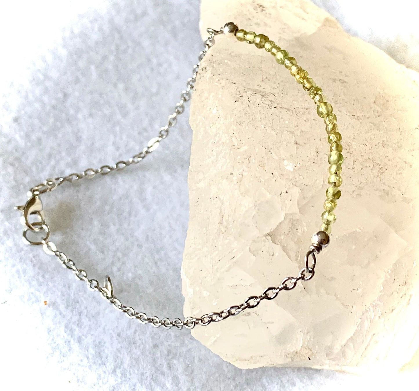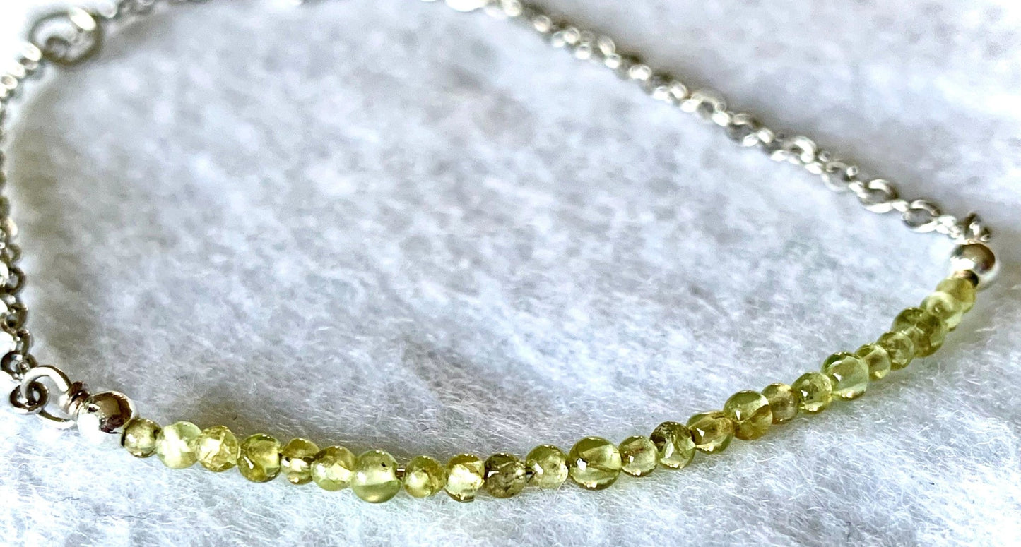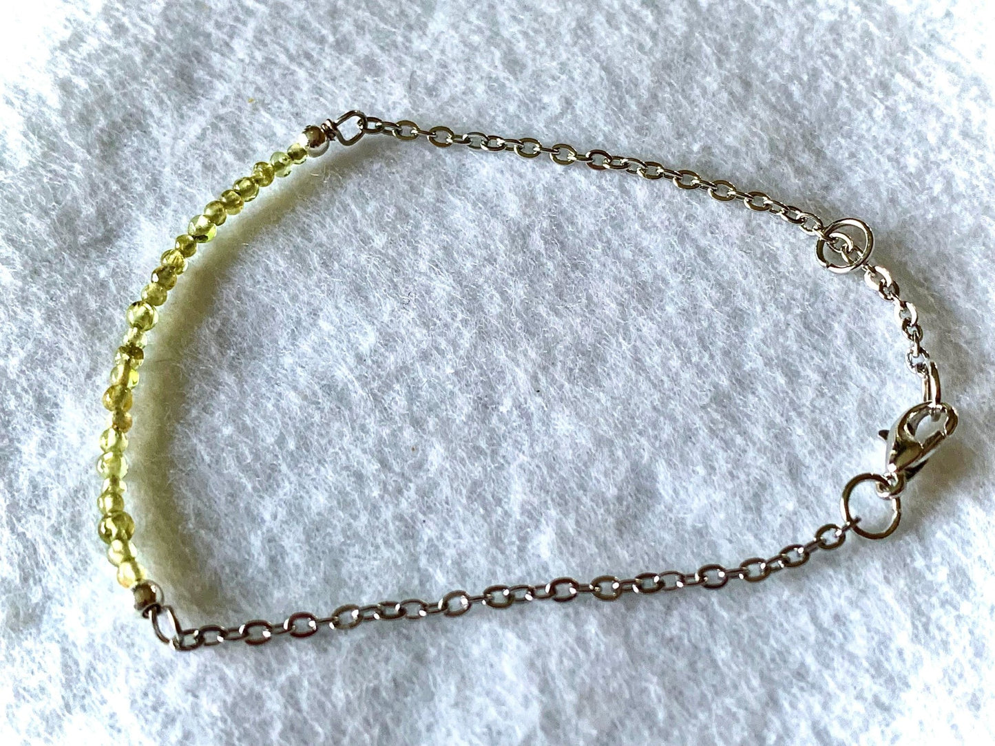 Kalinda Handmade Genuine Peridot Dainty Bracelet. The bracelet is adjustable. Peridot, in shades of olive, is one of the few gemstones that forms in only one color. Beautifully faceted, it evokes the lateness of summer and the onset of fall, as leaves morph from green to gold and hang like jewels in the sunlight. It is a crystal of warmth and well-being, mentally stimulating and physically regenerating. It carries the gift of inner radiance, sharpening the mind and opening it to new levels of awareness and growth, helping one to recognize and realize one’s destiny and spiritual purpose. [Raphaell, 150][Fernie, 163][Melody, 478][Hall, 213]
