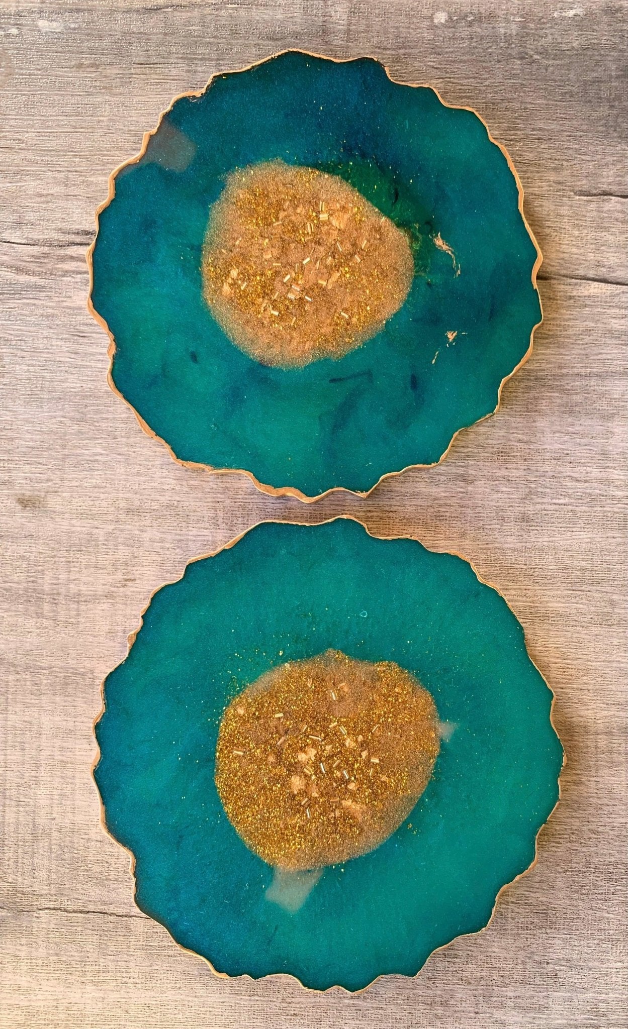 Handmade 5" Colorful Coasters available in a variety of colors. Most are made to order and are 9.99 each! These coasters are made entirely of resin and come in random, irregular shapes. These coasters are handmade in my home studio in California and each one is individually poured. No two coasters will look the exact same, making each set truly unique!
