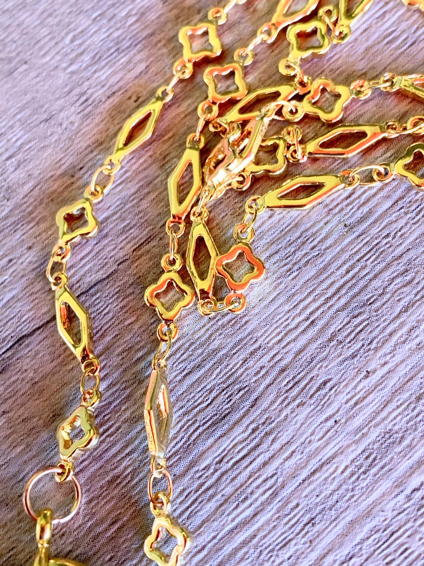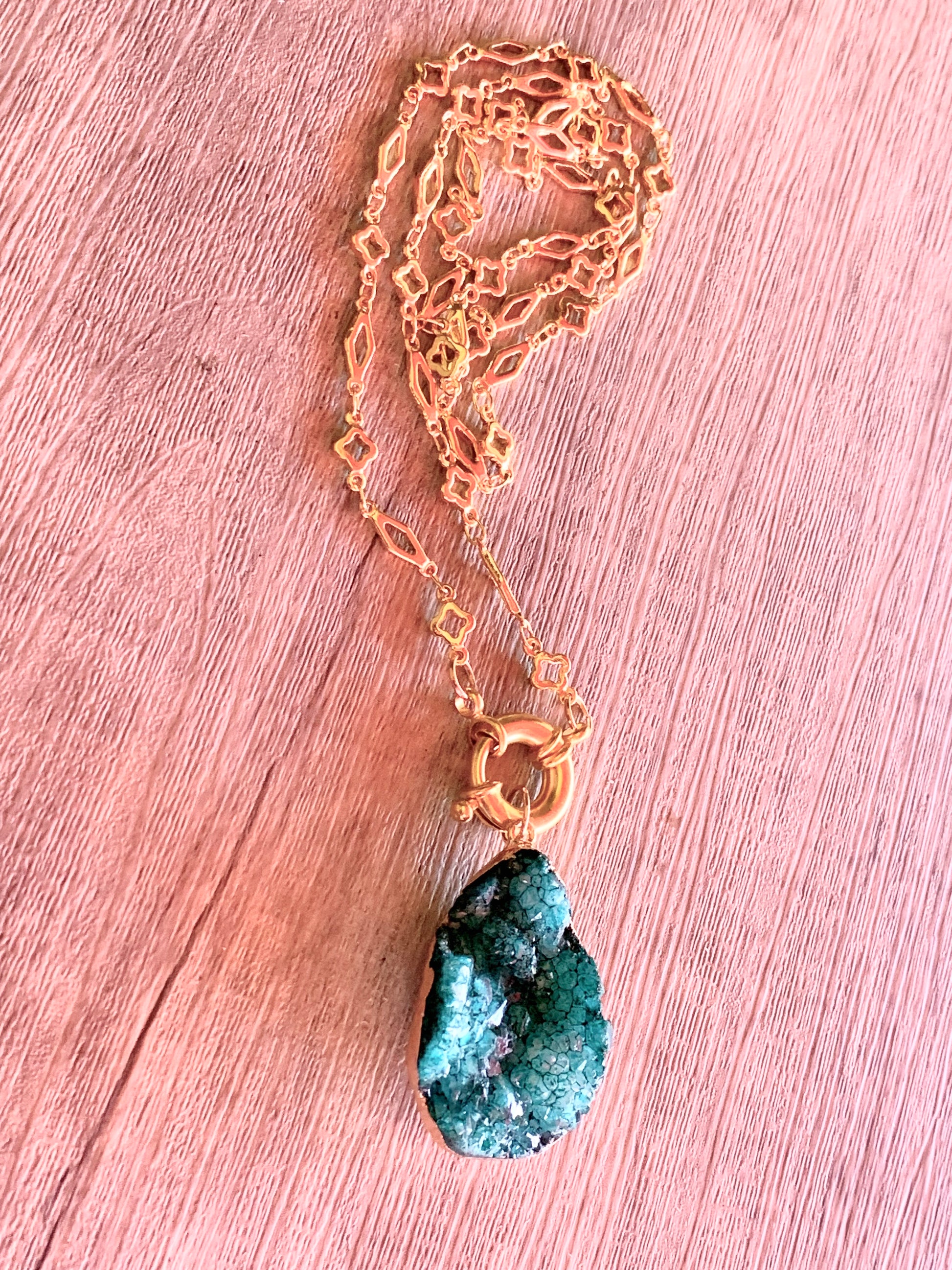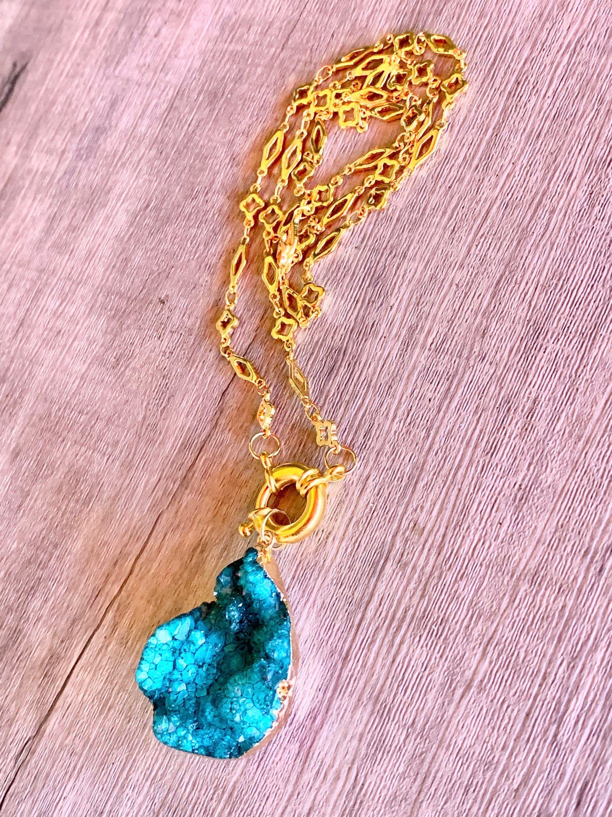 Elle Handmade Druzy Pendant On a 30" or 40" Gold Plated Moorish Pattern Necklace
