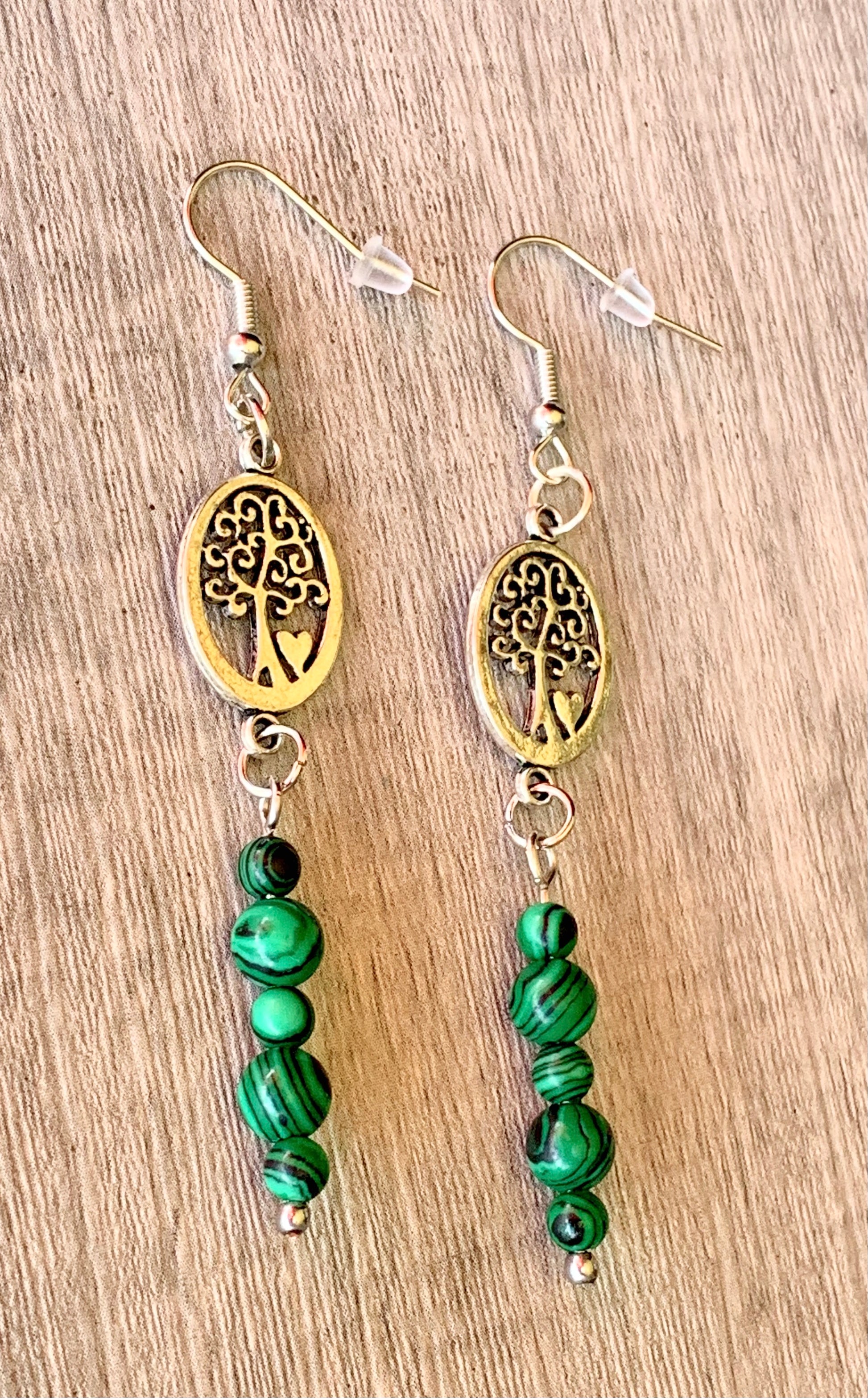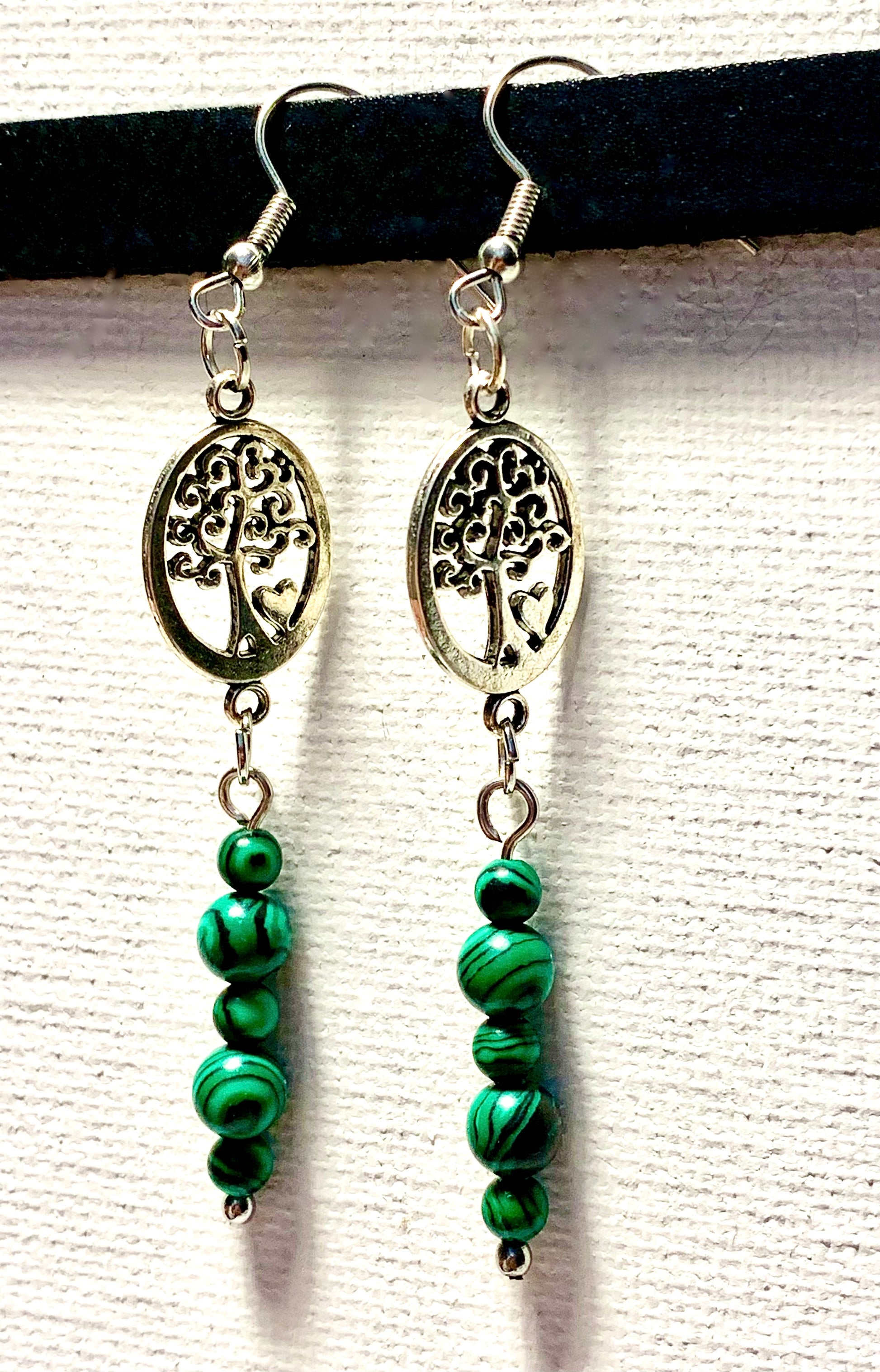 Illanna Handmade Malachite Dangle Earrings with Tree Pendants