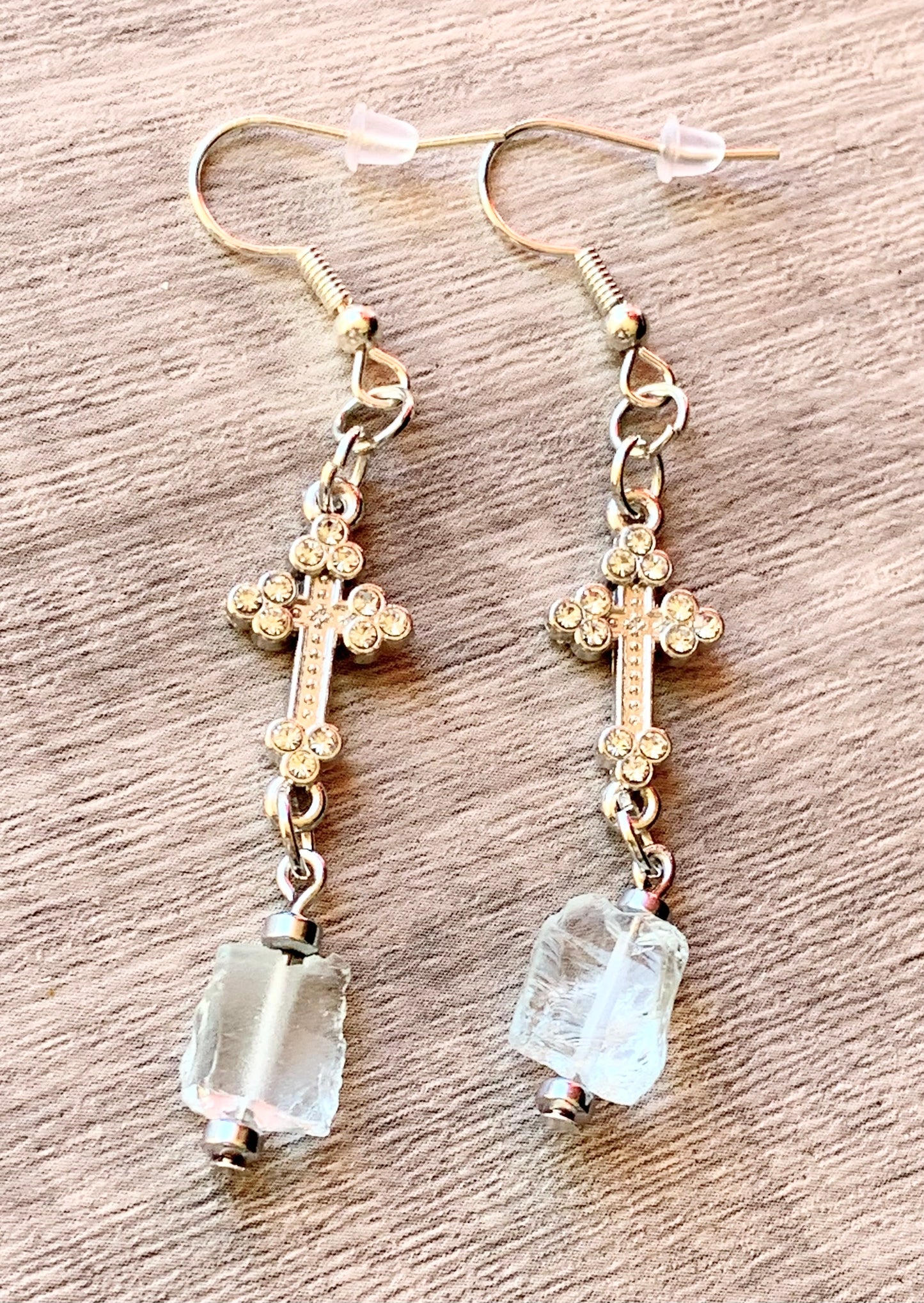 Linore Handmade Raw Light Blue Topaz and Silver Plated Hematite Earrings with a Rhinestone Cross