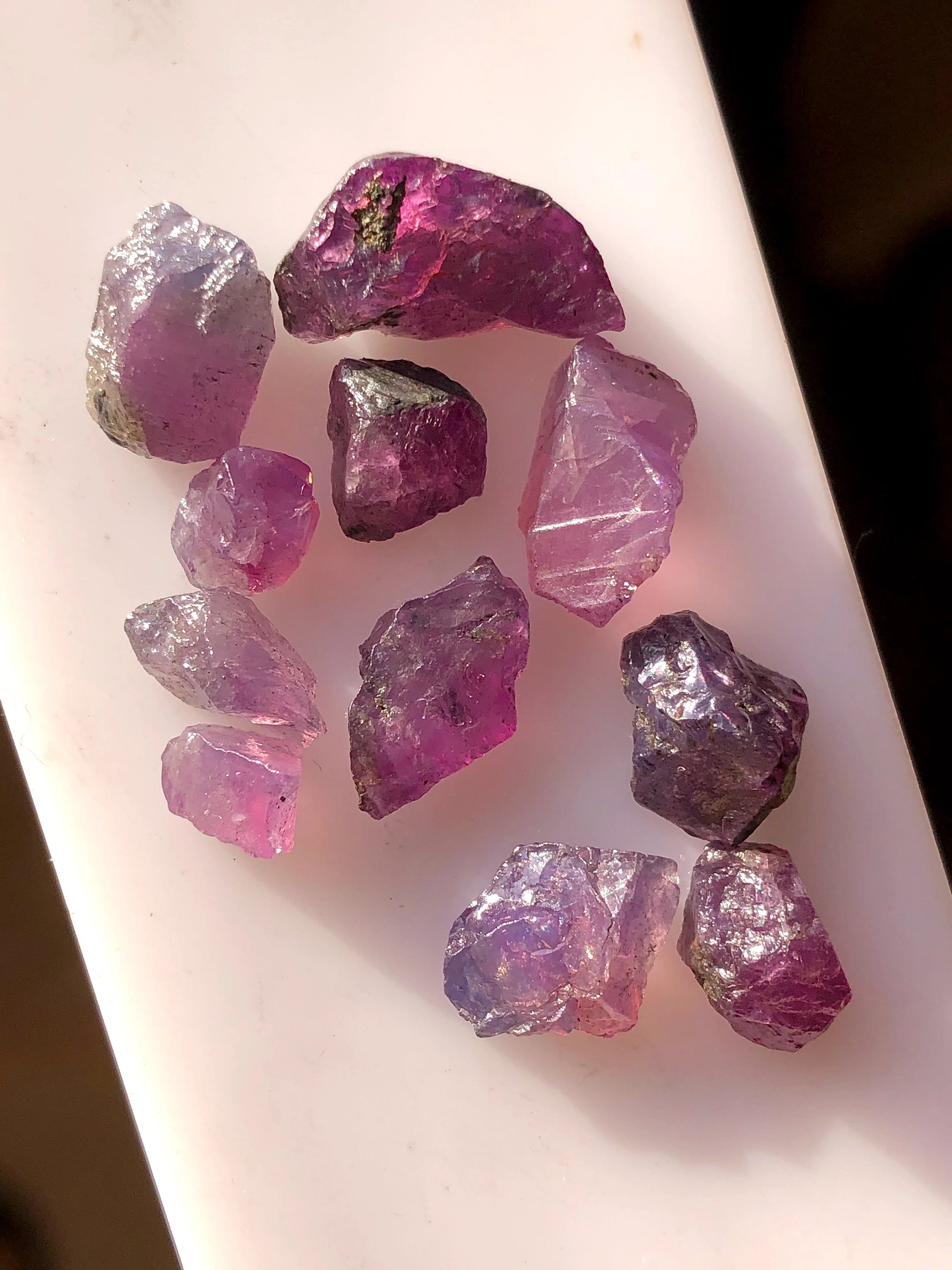 Explore these 11 natural lavender sapphire rough stones totaling 27.8 carats, sourced directly from the lush green valley of Kashmir region of Pakistan. Each piece averages approximately 2 carats, with individual stones ranging from 1.04 to 5 carats, making this an ideal starter lot for lapidary enthusiasts and jewelry designers.