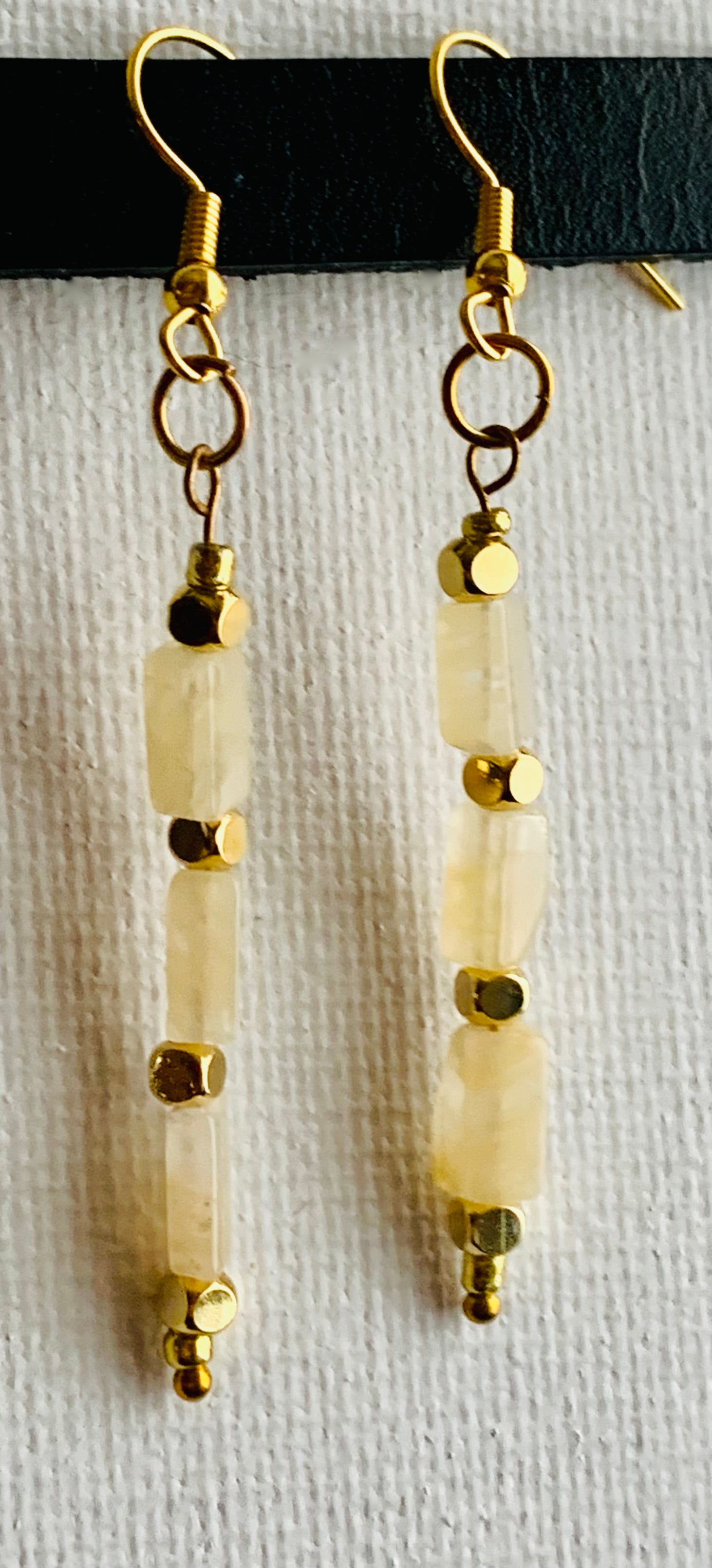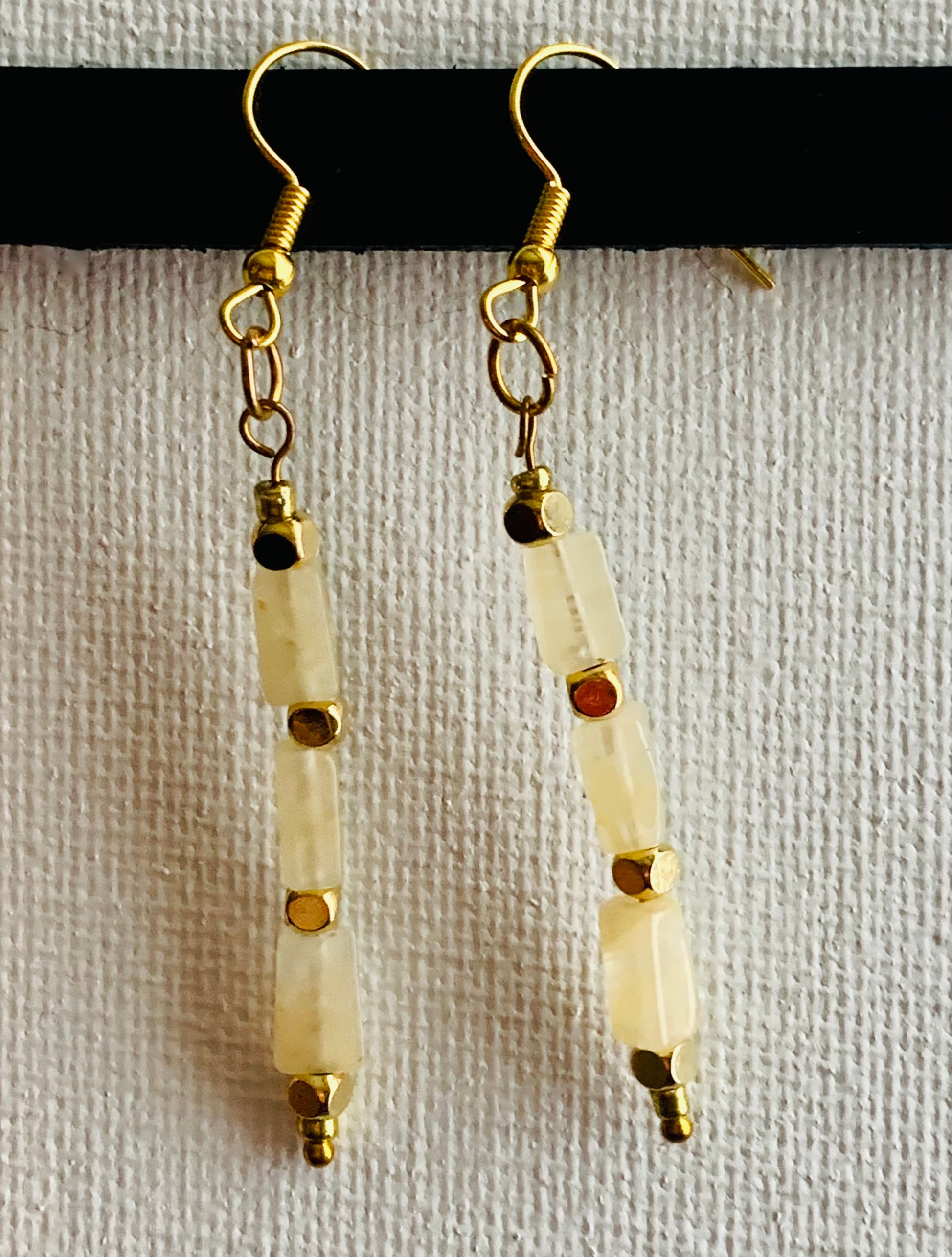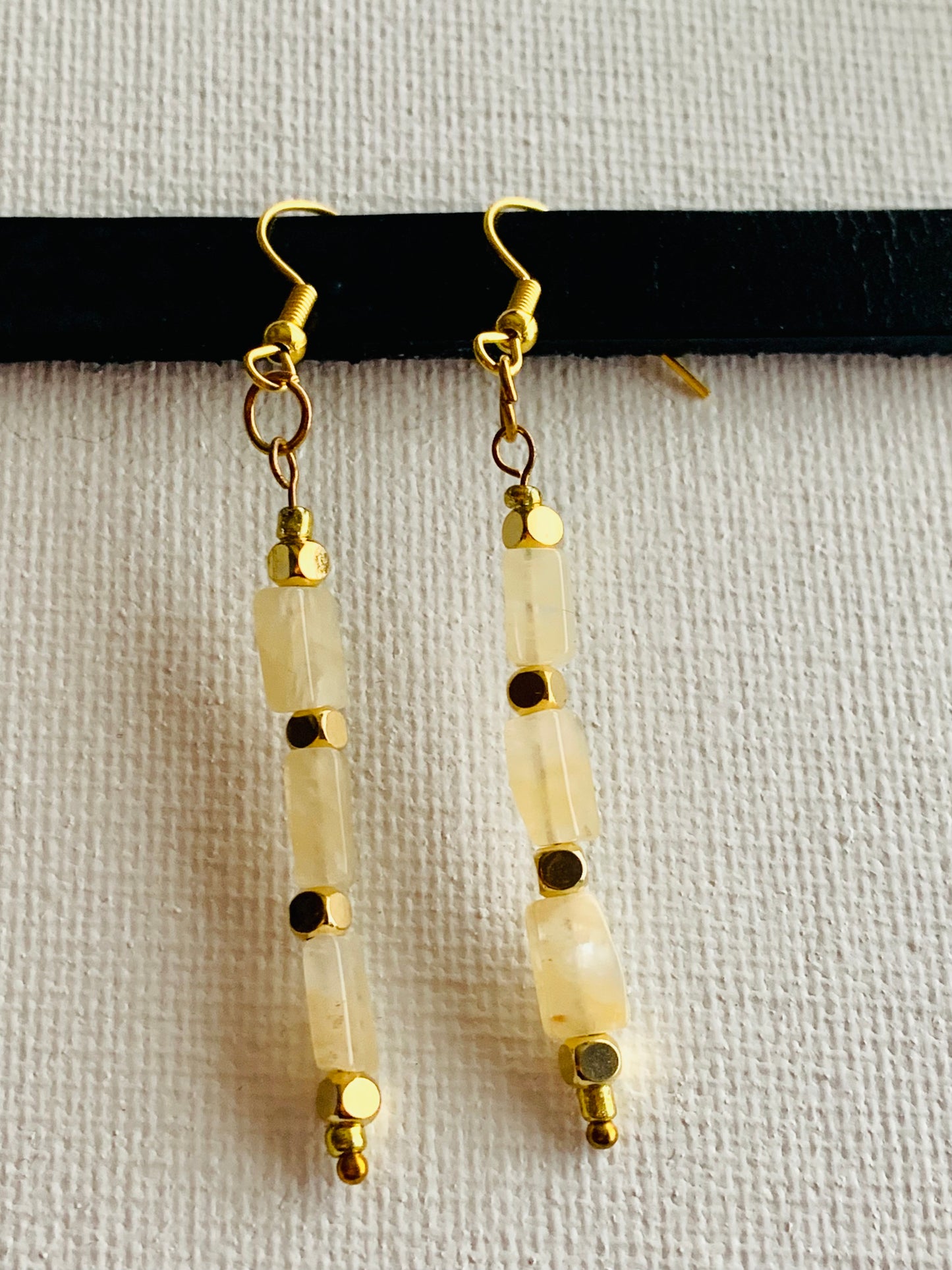 Accessorize your wardrobe with Heather Handmade's Cream Quartz Drop Earrings. Beautifully crafted with a stunning quartz stone and crafted to perfection, these earrings will bring a touch of elegance to any look. Enjoy the timeless beauty of quartz with every wear!
