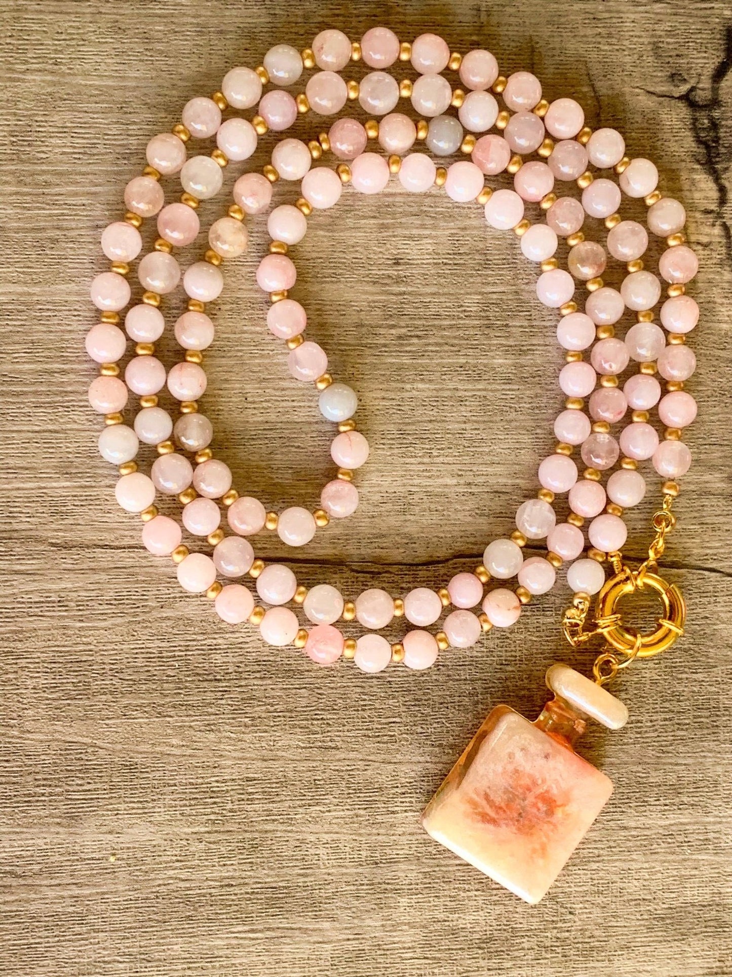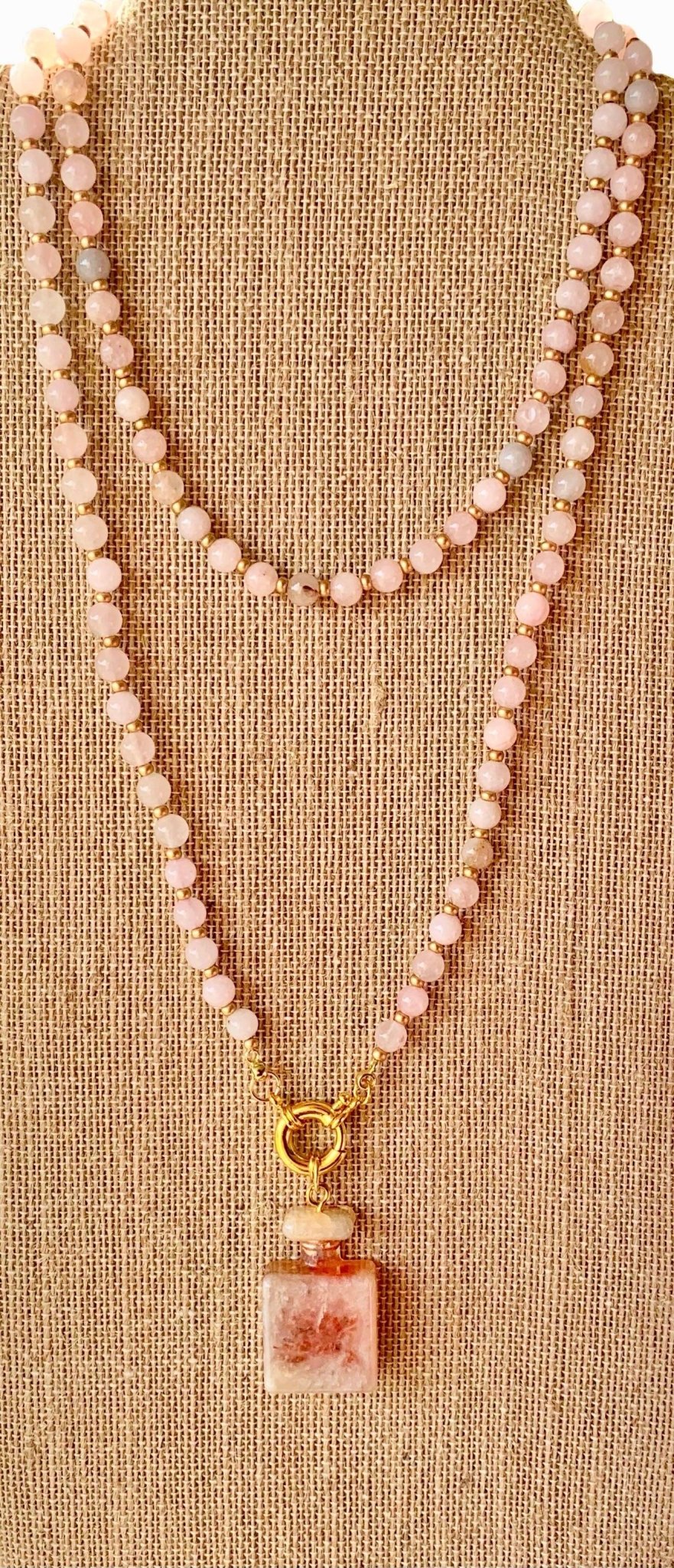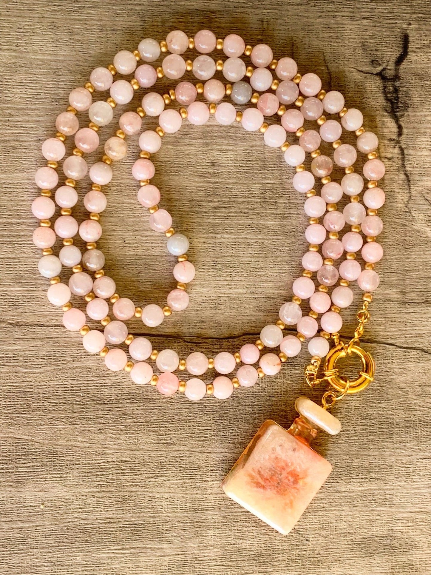 Love Potion Handmade Rose Quartz Beaded 36" Necklace With A Resin Perfume Bottle Pendant