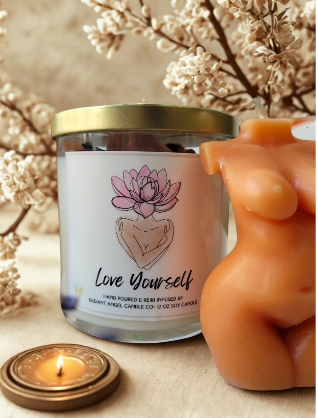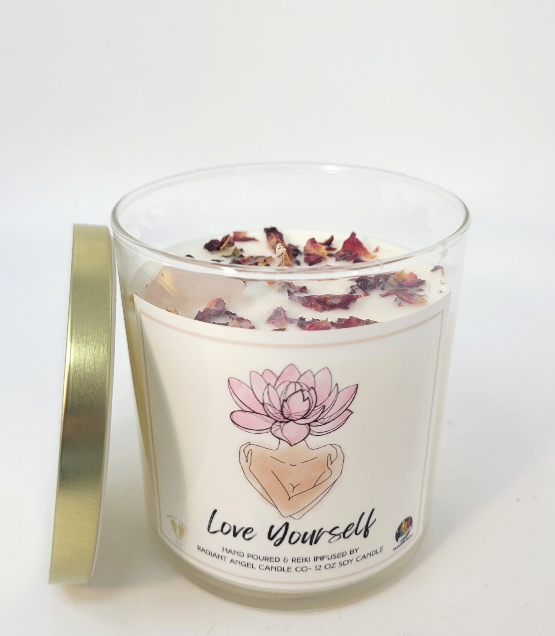 Love Yourself, inside and out and upside down. This candle evokes the sweet sweet scent of Self Love. It's a dreamy lush scent of floral and fruit. Cherry blossoms and peach, sweet fresh apple and a hint of mint. Adorned with a single rose quartz tumble stone and dried roses.