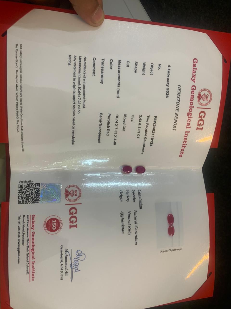 This beautiful set of loose natural ruby stones has a combined weight of 6.52 carats, consisting of two individual gems weighing 3.43 carats and 3.09 carats. The rubies feature an elegant oval shape and display an attractive purplish red colour with lively appeal. Sourced from Afghanistan, these gemstones reflect the natural character and charm of rubies from this region. The larger stone measures approximately 10.74 × 7.33 × 4.40 mm, offering a graceful size suitable for fine jewellery. Ruby is associated with the birth month of June, making these stones a meaningful choice for custom jewellery, collectors, or special occasion designs.