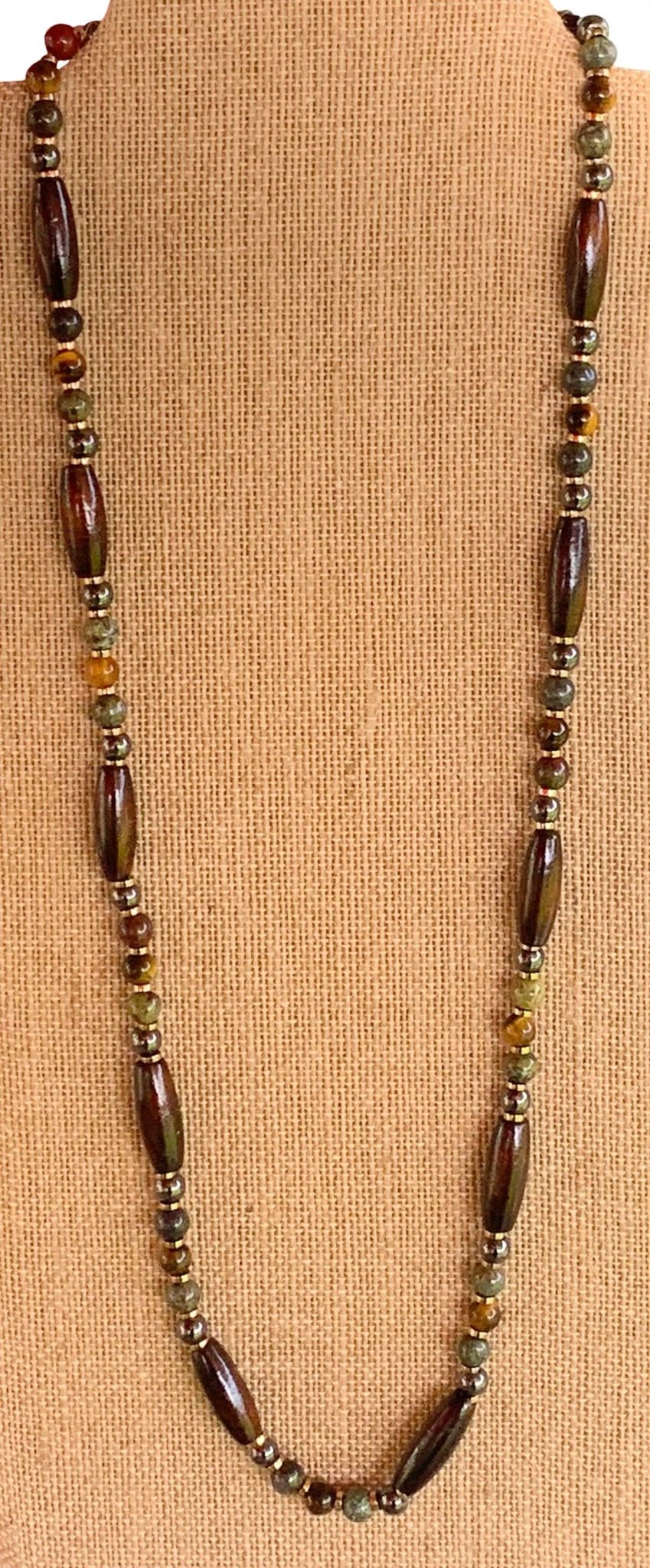 Parker Unisex Handmade Bloodstone, Tigers Eye, Hematite, And Wood 28" Beaded Necklace.
