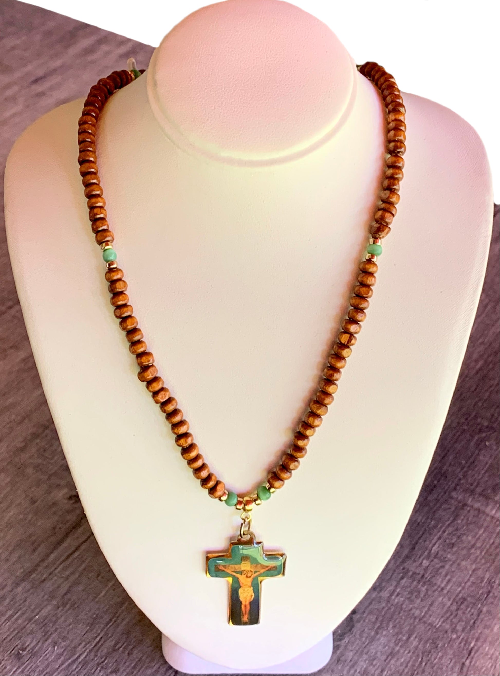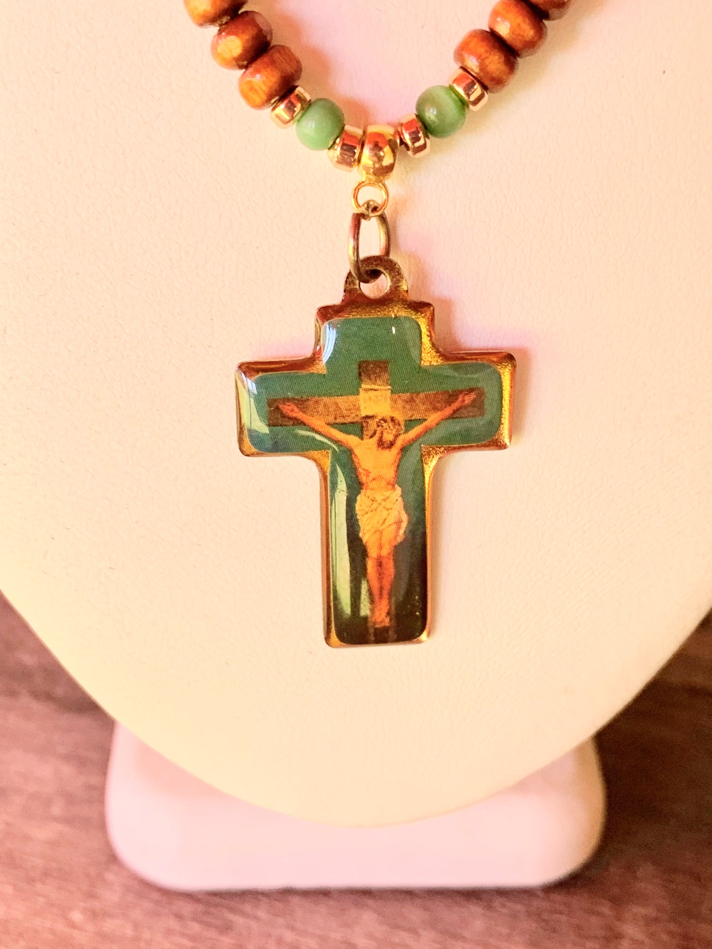 🔴SOLD🔴 Jesus Handmade Cats Eye, Gold Plated Hematite, and Wood with a Vintage One of a Kind Cross with Jesus Christ