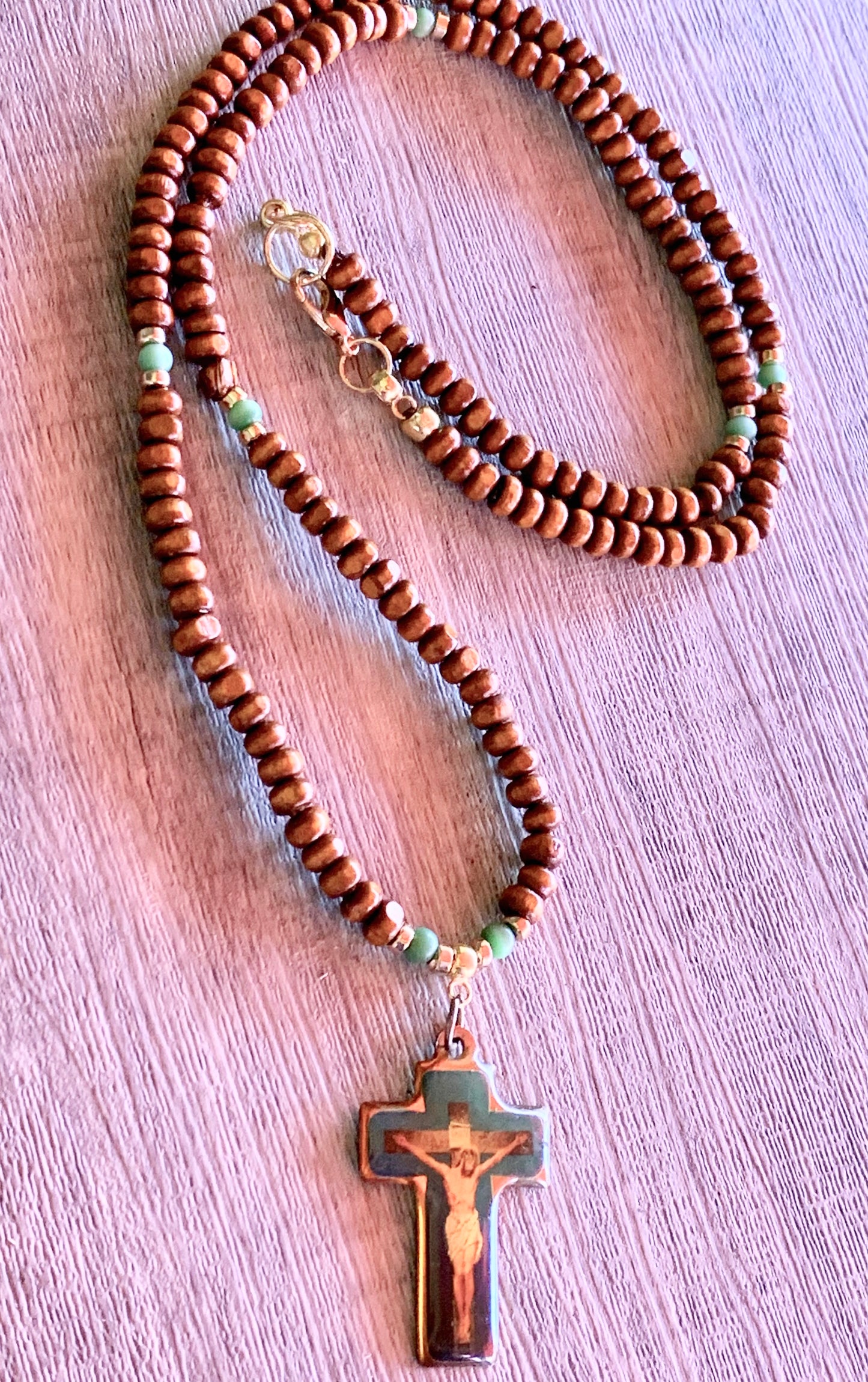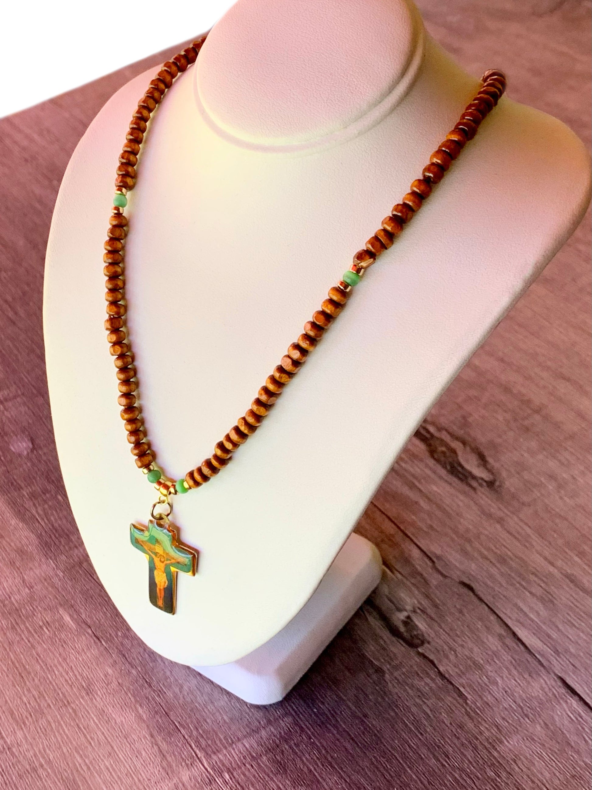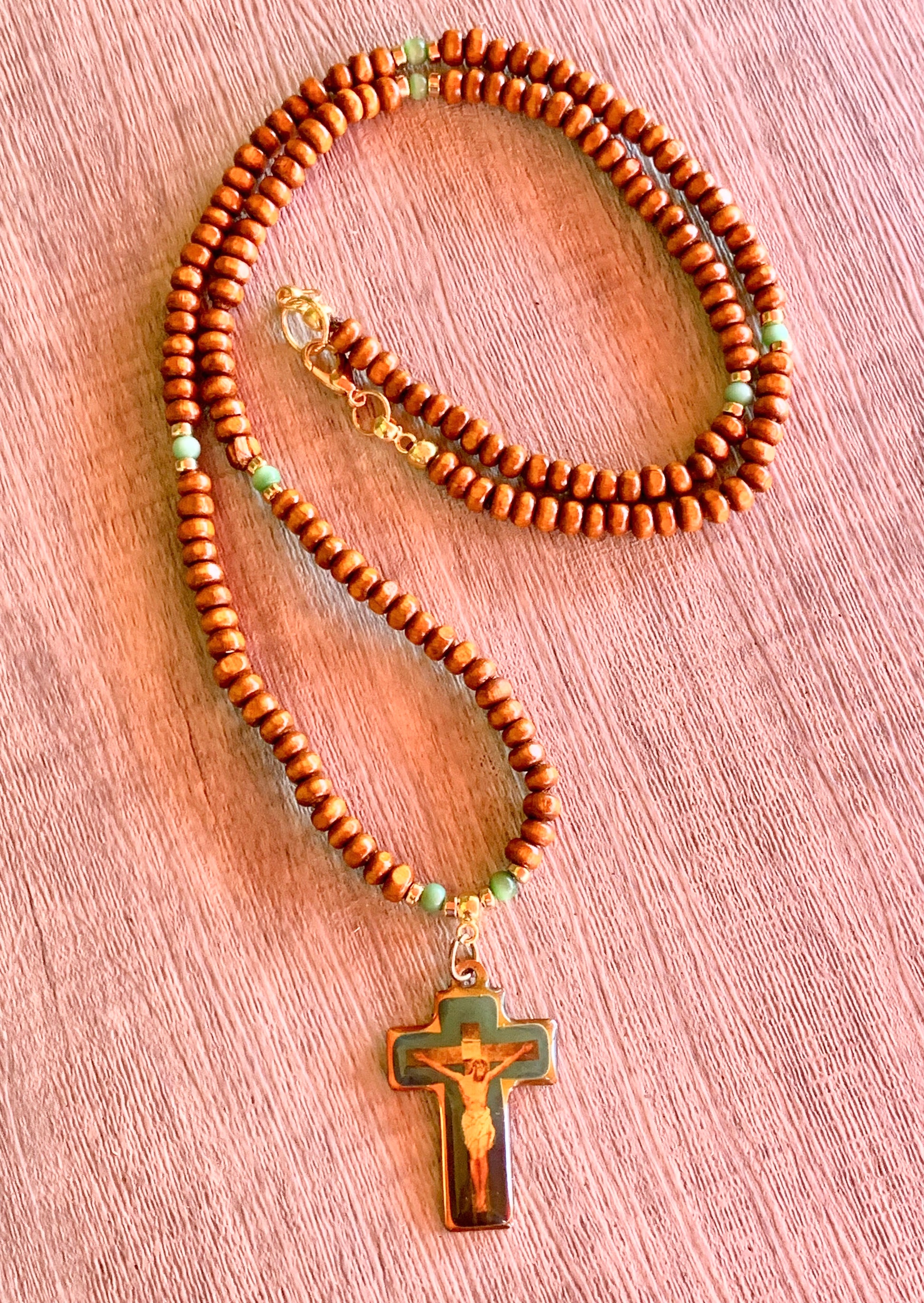 This handcrafted item features Cats Eye, Gold Plated Hematite, and Wood united by a rare vintage, refurbished, and polished Cross depicting Jesus Christ. This piece is individually crafted with care and is one of a kind. A perfect gift for any special occasion, please don't hesitate to contact us with any inqueries!